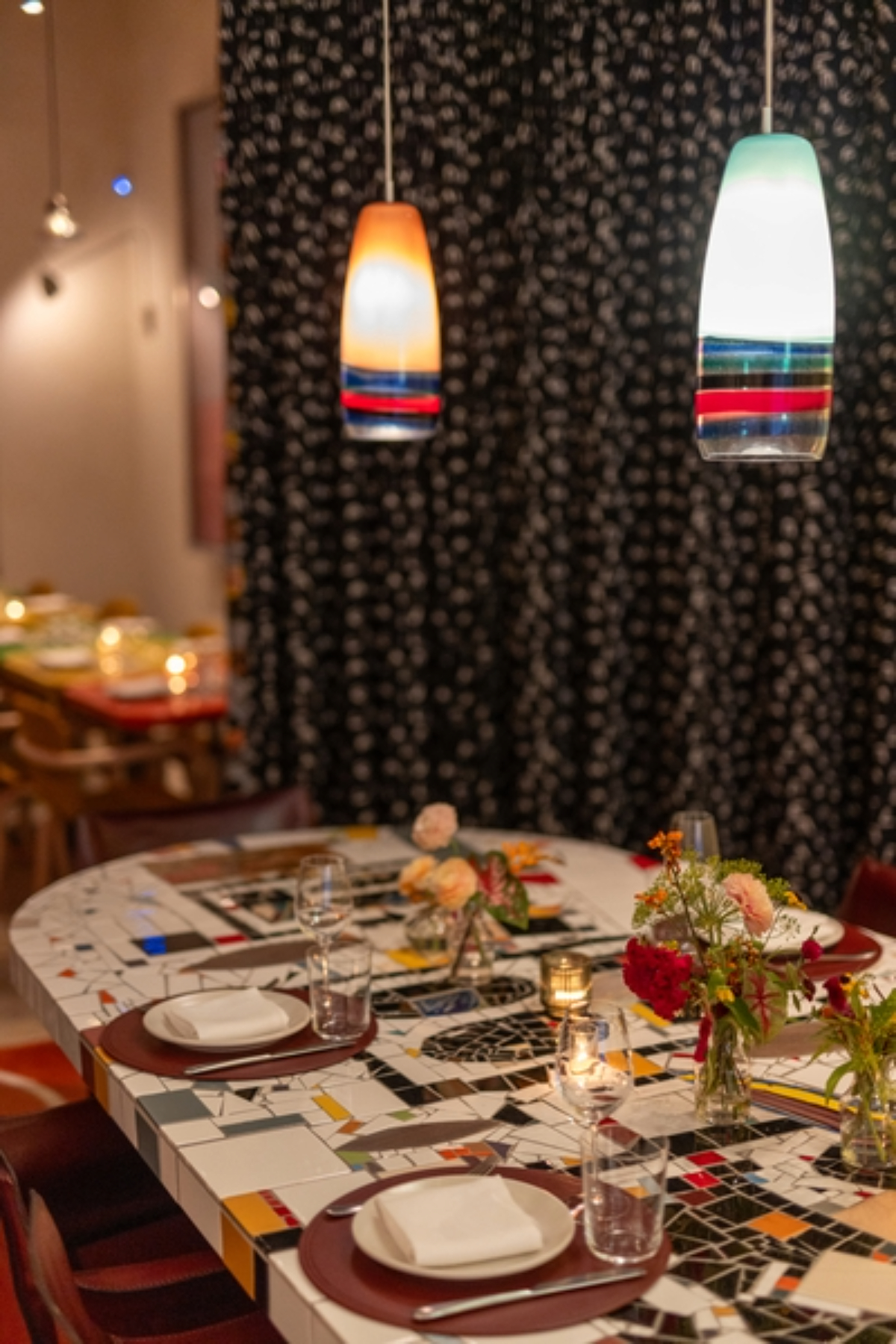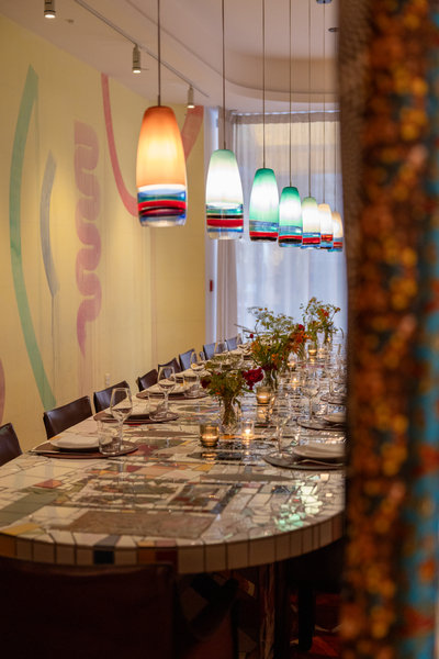 The Private Dining Room at Manuela seats up to 28 guests (or 31 guests with hired furniture) around a striking 7-meter bespoke mosaic table by acclaimed artist Rashid Johnson, anchored by his brilliant red custom rug beneath. Designed as both intimate and impressive, the room blends art and atmosphere seamlessly, making it as memorable as the gatherings it hosts.